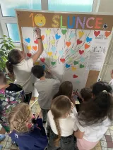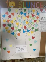 Děti během dne přemýšlely o dobrých skutcích a zapisovaly je do papírových srdíček, která společně vytvořila krásnou nástěnku plnou milých vzkazů. Atmosféra byla plná úsměvů, podpory a vzájemné pomoci. Tento den nám všem připomněl, jak důležité je být k sobě laskaví – nejen dnes, ale každý den.